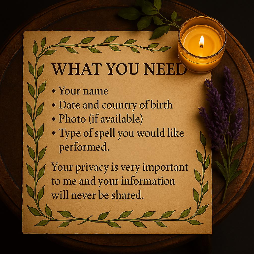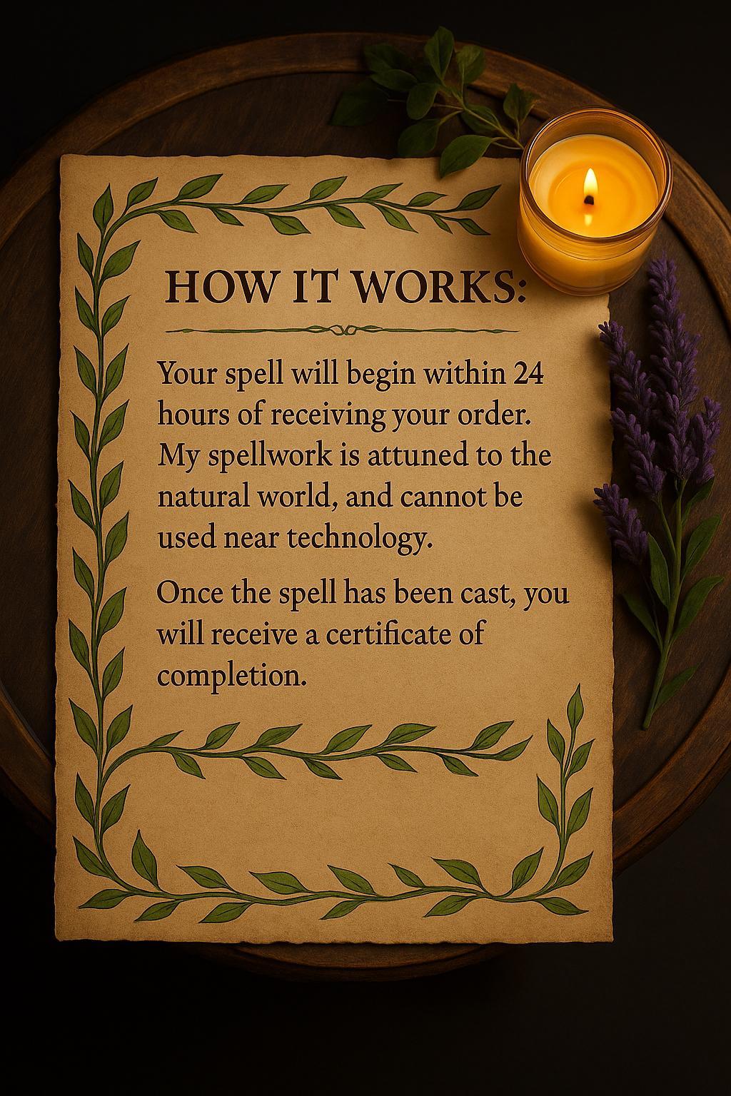 - This spell will be cast according to your desires — a personal touch of magic designed specifically for your needs. Whether you seek guidance in matters of the heart, career, or life path, this spell work is crafted with care, compassion, and harmony with the natural world.